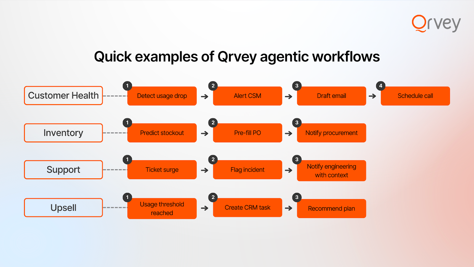 Through API integrations and event triggers, agents initiate next steps—alerts, tickets, orders, CRM updates—closing the loop between analytics and execution.