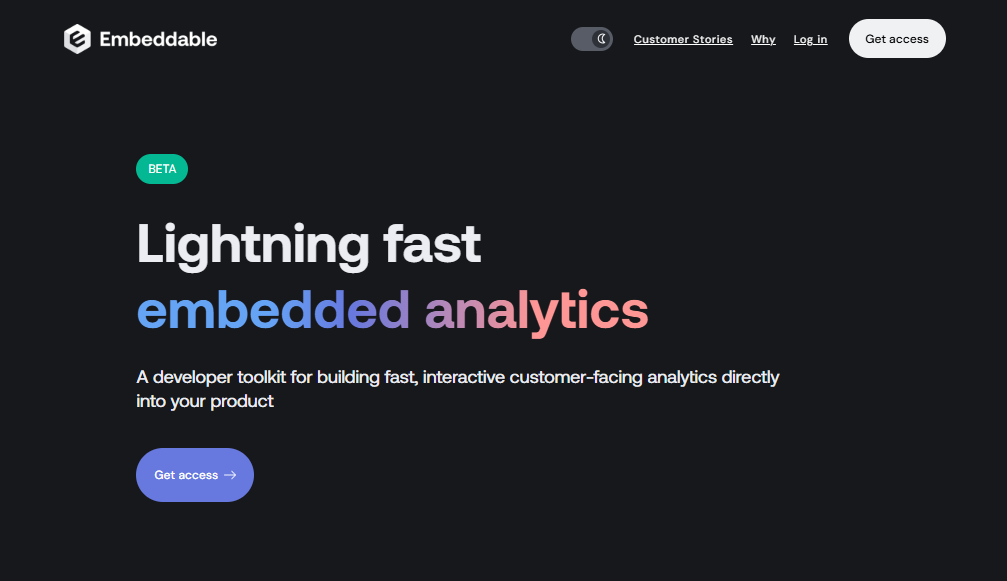 Embeddable | Best for product teams needing modular, no-code embedded analytics with flexible front-end design and rapid deployment in customer-facing applications. |