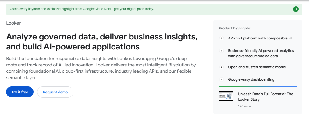 Looker (Google Cloud) | Best for enterprises deeply integrated into Google Cloud, needing robust data modeling via LookML. |