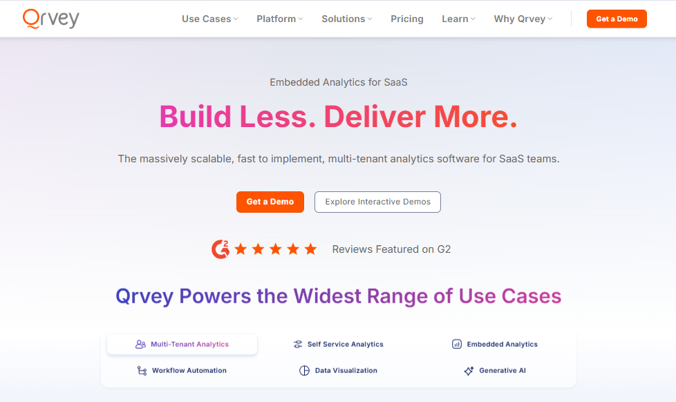 Qrvey delivers a complete multi-tenant analytics solution built specifically for SaaS companies. The platform combines a native data lake, semantic layer, and embedded BI components that scale with your business.