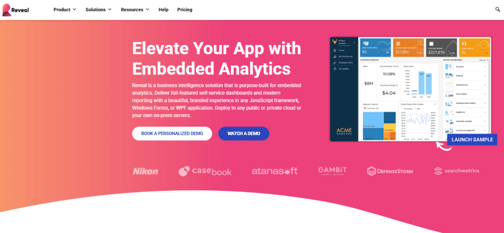 Reveal BI, owned by Infragistics, focuses on self-hosted embedded analytics with SDK-based customization. Their platform gives you full control over deployment and data security.