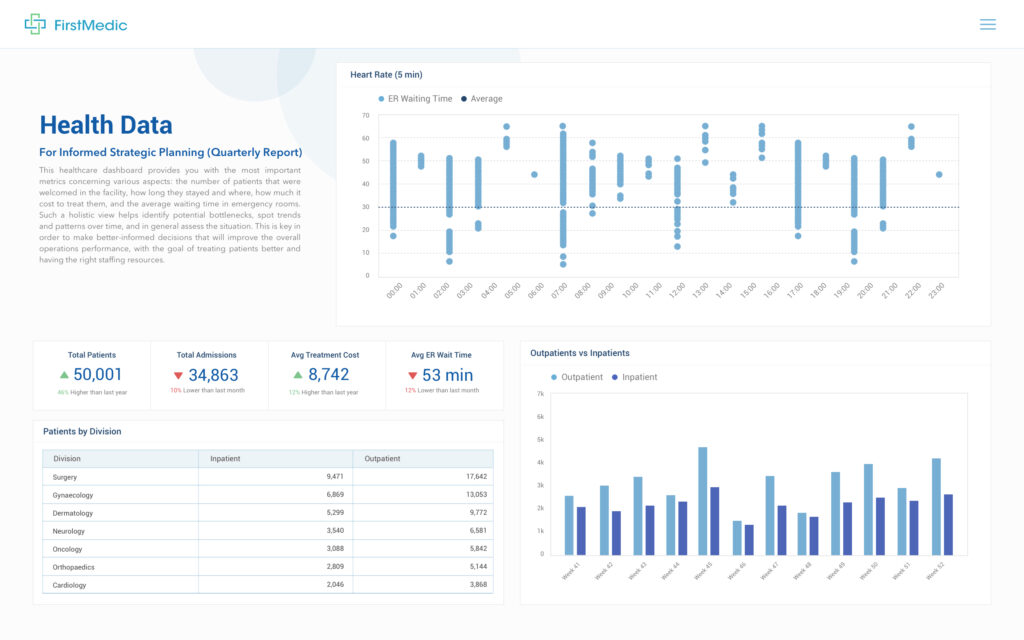 A telemedicine platform might include dashboards showing patient satisfaction scores, appointment completion rates, and clinical outcomes.