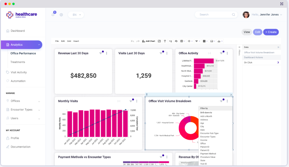 Medical platforms use embedded analytics to help providers track patient outcomes, medication adherence, and practice metrics.