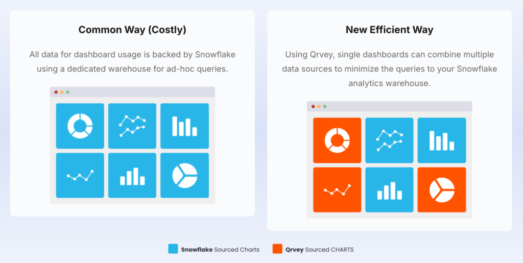 Real cost savings are seen when you use Qrvey for near-real time data queries and using Snowflake (for example) only for real-time queries. See illustration below.