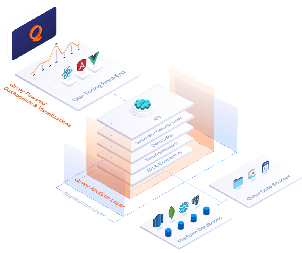 Qrvey eliminates this dilemma by giving you complete architecture that deploys in weeks. You get the full stack: data ingestion from any sources, a data lake optimized for multi-tenant analytics, semantic modeling tools, white-label visualization, and APIs making everything embeddable.