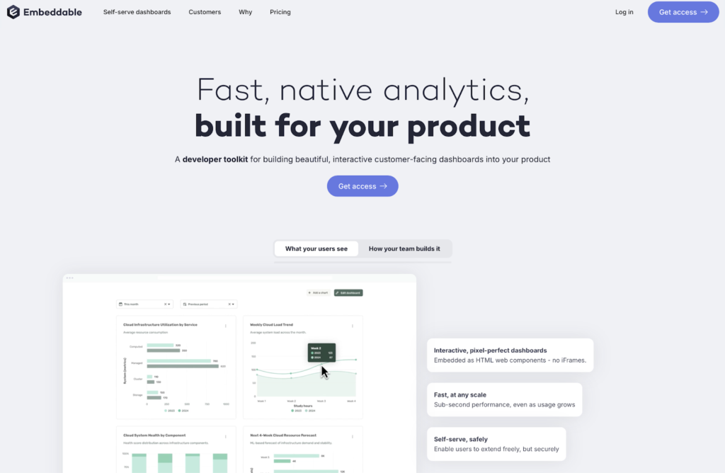 Embeddable is a developer toolkit for building interactive customer-facing dashboards. It supports single- and multi-tenant SaaS applications with row-level and database-level security enforced by default.