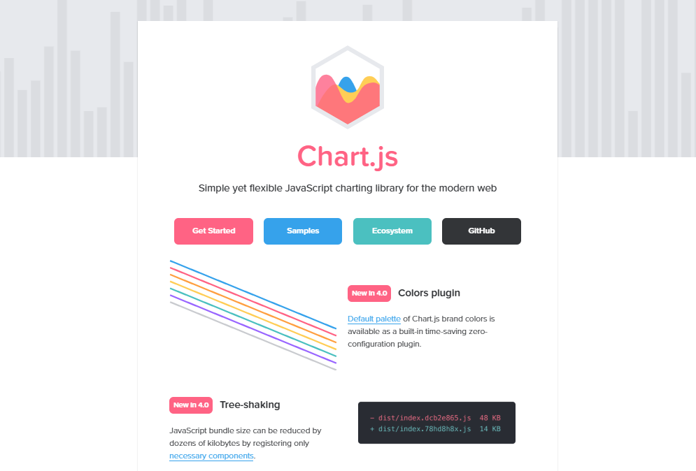 Built on Canvas with open-source code, Chart.js works with vanilla JavaScript or integrates into React, Vue, and Angular. The modular design lets you tree-shake unused components, shrinking bundle size from 48KB down to 14KB when you only need basic bar charts.