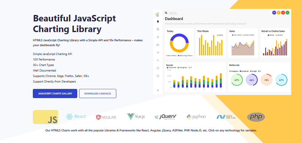 Built on Canvas with cross-framework compatibility, CanvasJS renders across React, Angular, jQuery, and backend frameworks like ASP.NET and PHP. The simple API means configuration stays manageable.