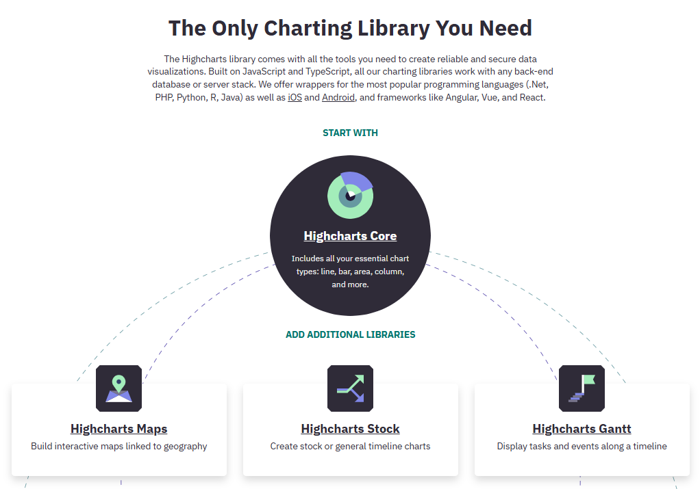 Highcharts supports React, Angular, Vue, Python, R, and mobile platforms through official wrappers. It renders using SVG for crisp scaling and accessibility.
