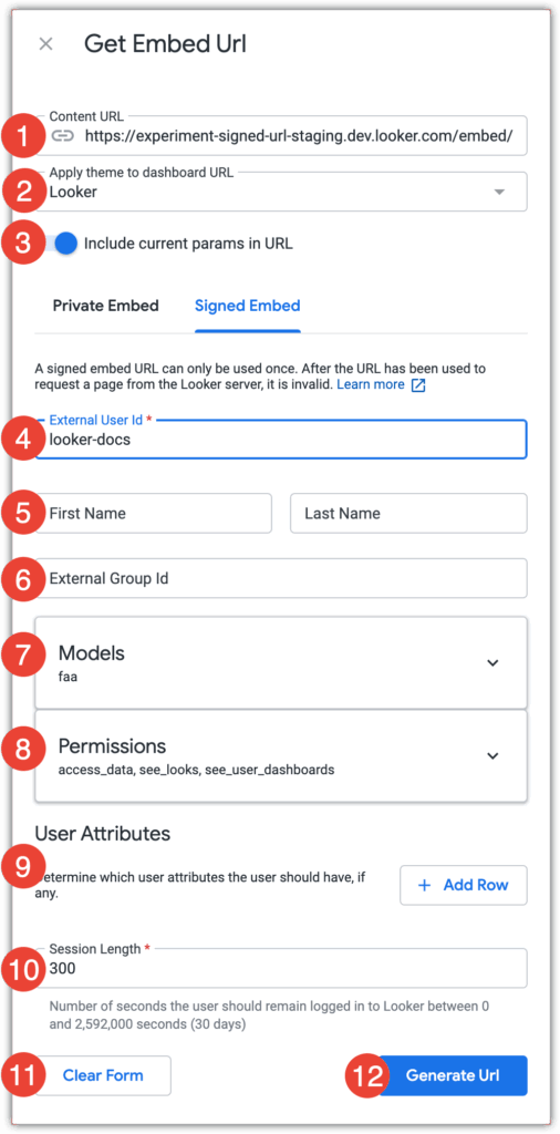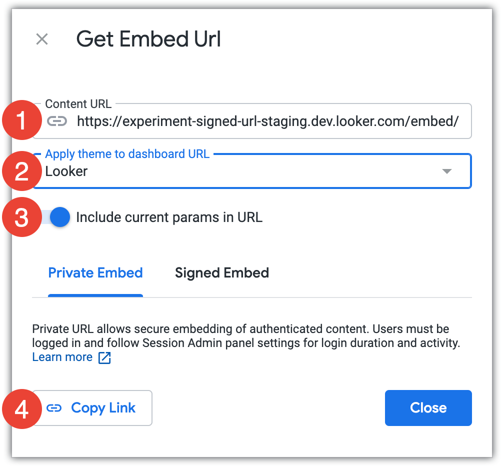 - Build the URL: Include parameters like user ID, permissions, model access, and any filters or themes you want applied.