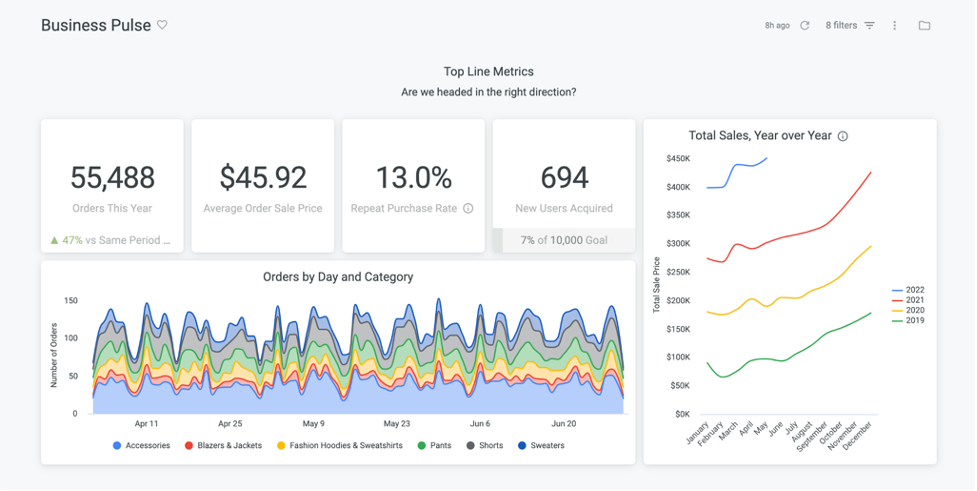 Looker is a popular choice for embedded analytics. In short—because of its powerful data modeling, secure architecture, and tight integration with popular tools.