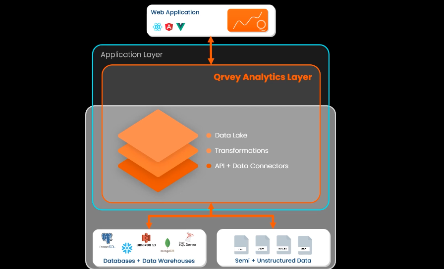 Your customer data likely lives in application databases, data warehouses, maybe even third-party APIs. Qrvey’s data pipeline connects to these sources and consolidates them into an analytics-optimized data lake.