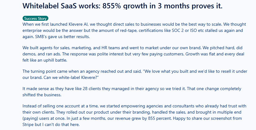 Klevere AI spent months struggling with direct enterprise sales: facing procurement delays, high churn rates, and escalating customer acquisition costs. Their breakthrough came when they pivoted to become a white label SaaS provider for agencies and consultants.