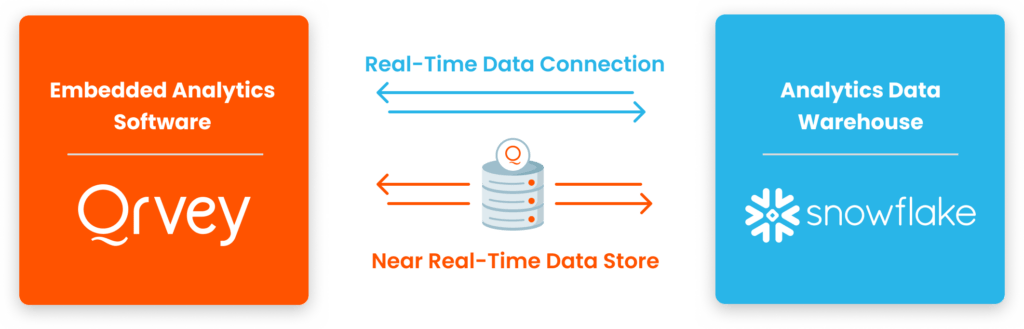 Snowflake maintains its role as the primary data warehouse and the source of real-time data, but syncs data to Qrvey to power multi-tenant analytics.